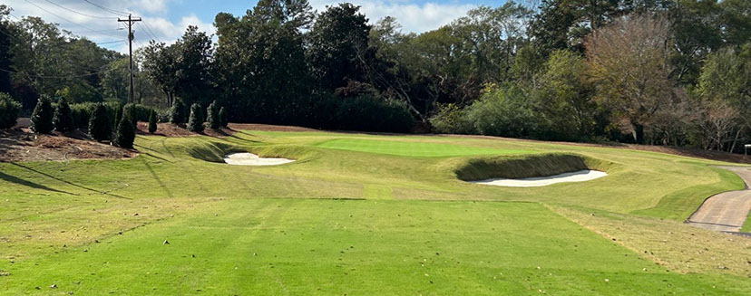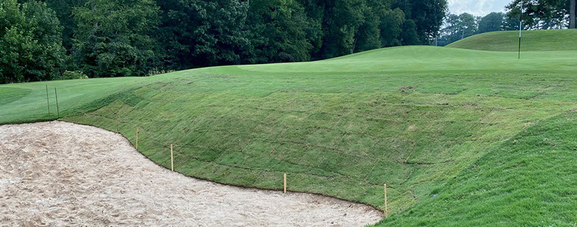 The turf in this fairway needed to be replaced due to shade and the slope being north facing (winterkill damage). Everything was sprayed with non-selective herbicides and then all dead material was stripped and removed. The slopes in this fairway were altered to be less severe and channel water towards the drains at the bottom. It was regraded and then sodded with new Tahoma 31 Bermudagrass.